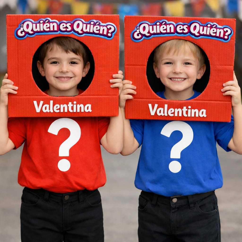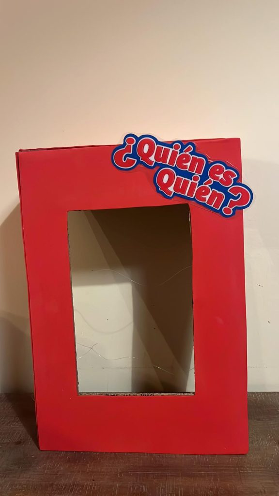 - Crea tu marco con cartón (Dimensiones aproximadas: tamaño A3-el hueco tamaño A4). Lo puedes pintar o cubrir con Goma Eva de rojo/azul (equipo elegido). En la parte superior se colocan las letras «¿Quién es Quién?» y el la inferior el nombre de tu personaje. No olvides colocar un hilo de pescar para poder colgar el marco y no tener que sujetarlo todo el tiempo.